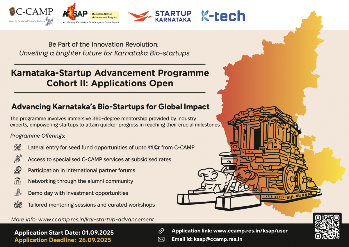 In line with Karnataka's thriving biotech landscape, C-CAMP, along with the support from Department of IT, BT, and S&T, Government of Karnataka, has introduced the Karnataka Startup Advancement Programme (K-SAP). This initiative directly aligns with the state's dedication to nurturing startups, aiming to propel them towards success and longevity within the dynamic entrepreneurial environment.