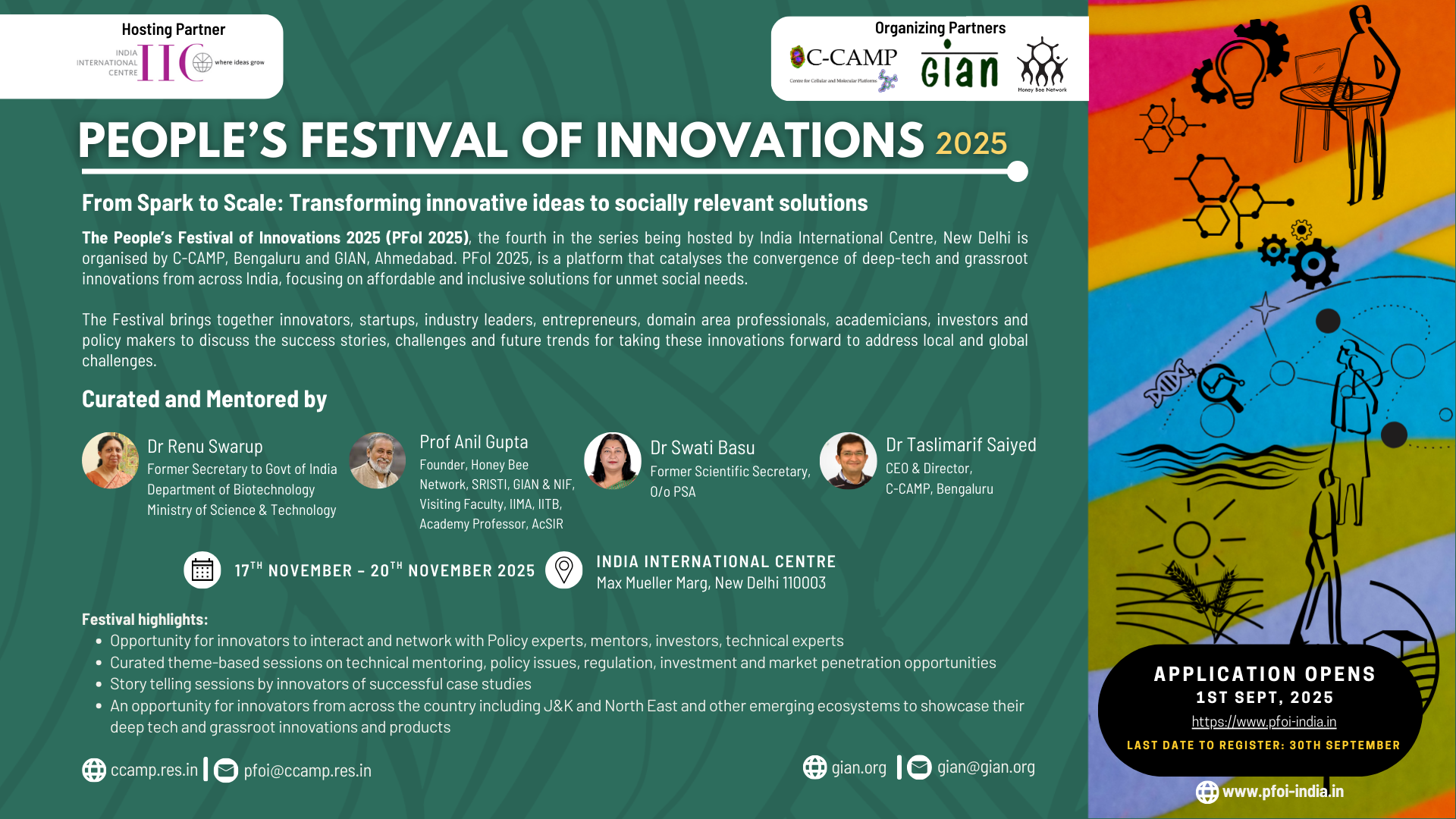 It's PFoI time of the year again! C-CAMP's annual celebration of people's innovative spirit, the People's Festival of Innovations, is back with its 4th edition! The CCAMP-Gujarat Grassroots Innovation Augmentation Network, GIAN-Honey Bee Network collaboration #PFoI2025 announces opening of registrations!
