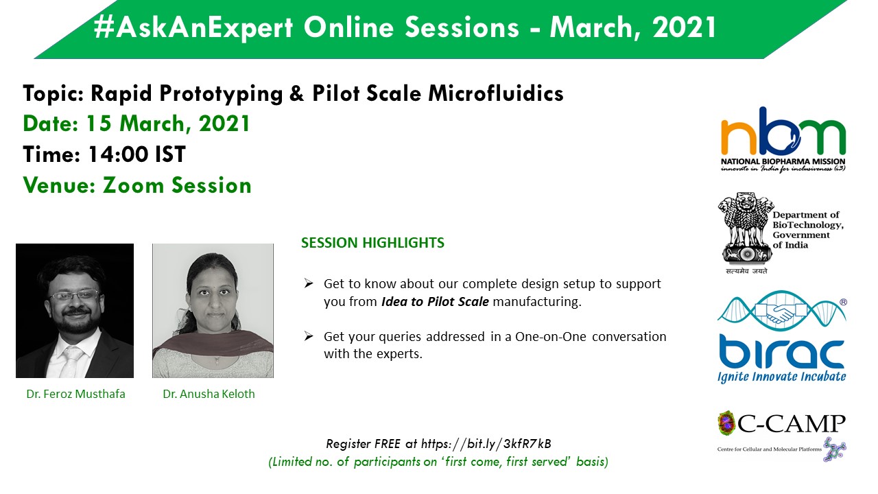 CCAMP's Ask An Expert series is back! Announcing the first session on Rapid Prototyping & Pilot Scale Microfluidics with experts Dr Feroz Musthafa and Dr Anusha Keloth, of National Biopharma Mission supported Rapid Prototoyping Facility, uFab at C-CAMP