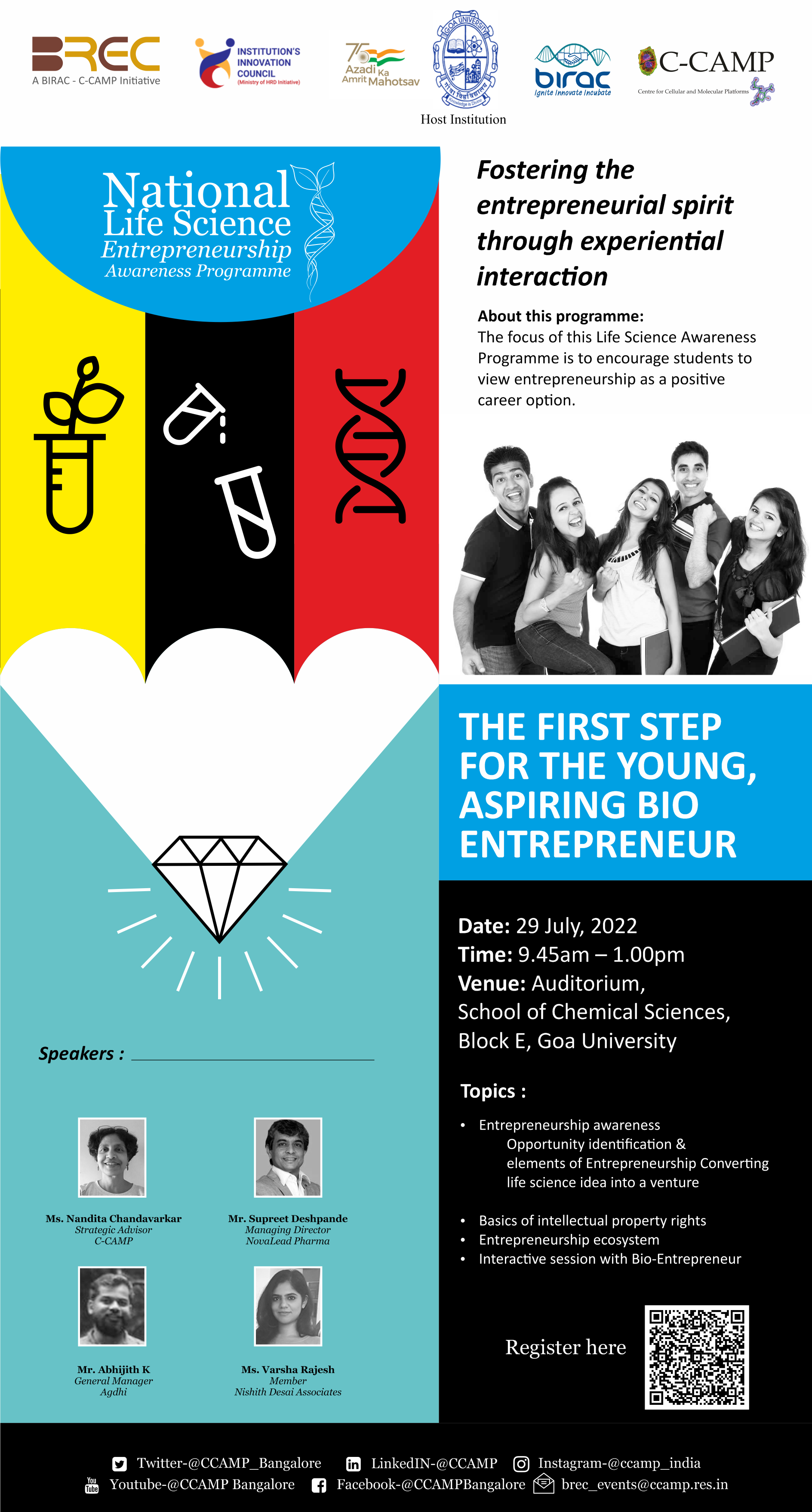CCAMP under the BREC program with BIRAC is holding an in-person edition of National Lifescience Entrepreneurship Awareness program at Goa University