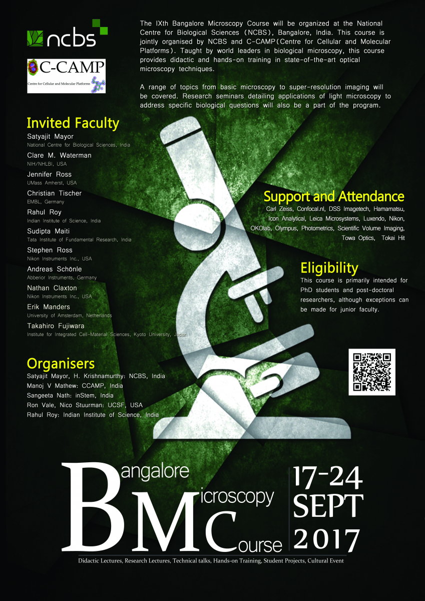 The IXth Bangalore Microscopy Course will be organized at the NCBS, Bangalore, India during 17-24 September 2017. Lectures will be combined with hands-on training in a dedicated teaching laboratory equipped with many state-of-the-art microscopes.