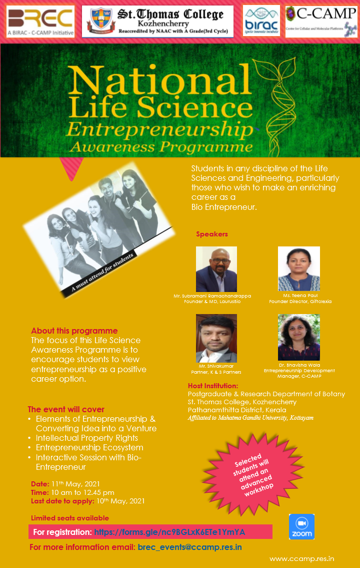 CCAMP under BREC announces a virtual National Life Science Entrepreneurship Awareness Program open to all Life Sciences students nationwide