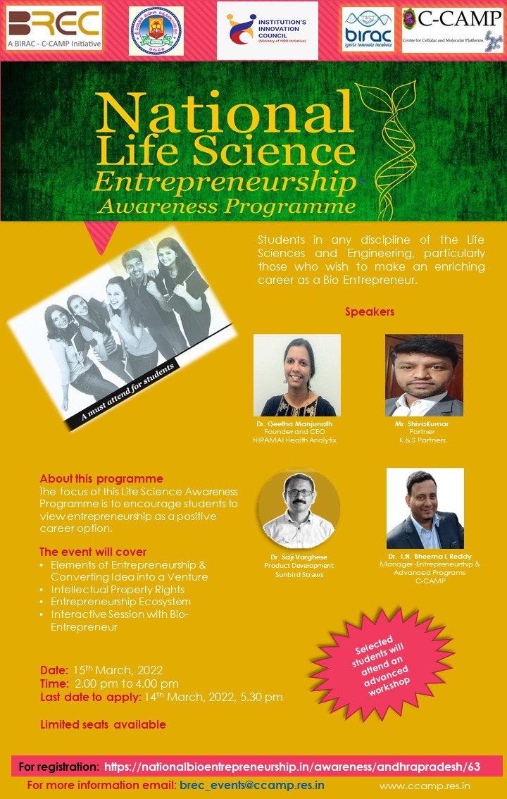C-CAMP under BREC program is organizing an online life science entrepreneurship awareness program on the 15th March with host Sri Padmavati Mahila Visvavidyalayam (all women's university), Tirupati, Andhra Pradesh