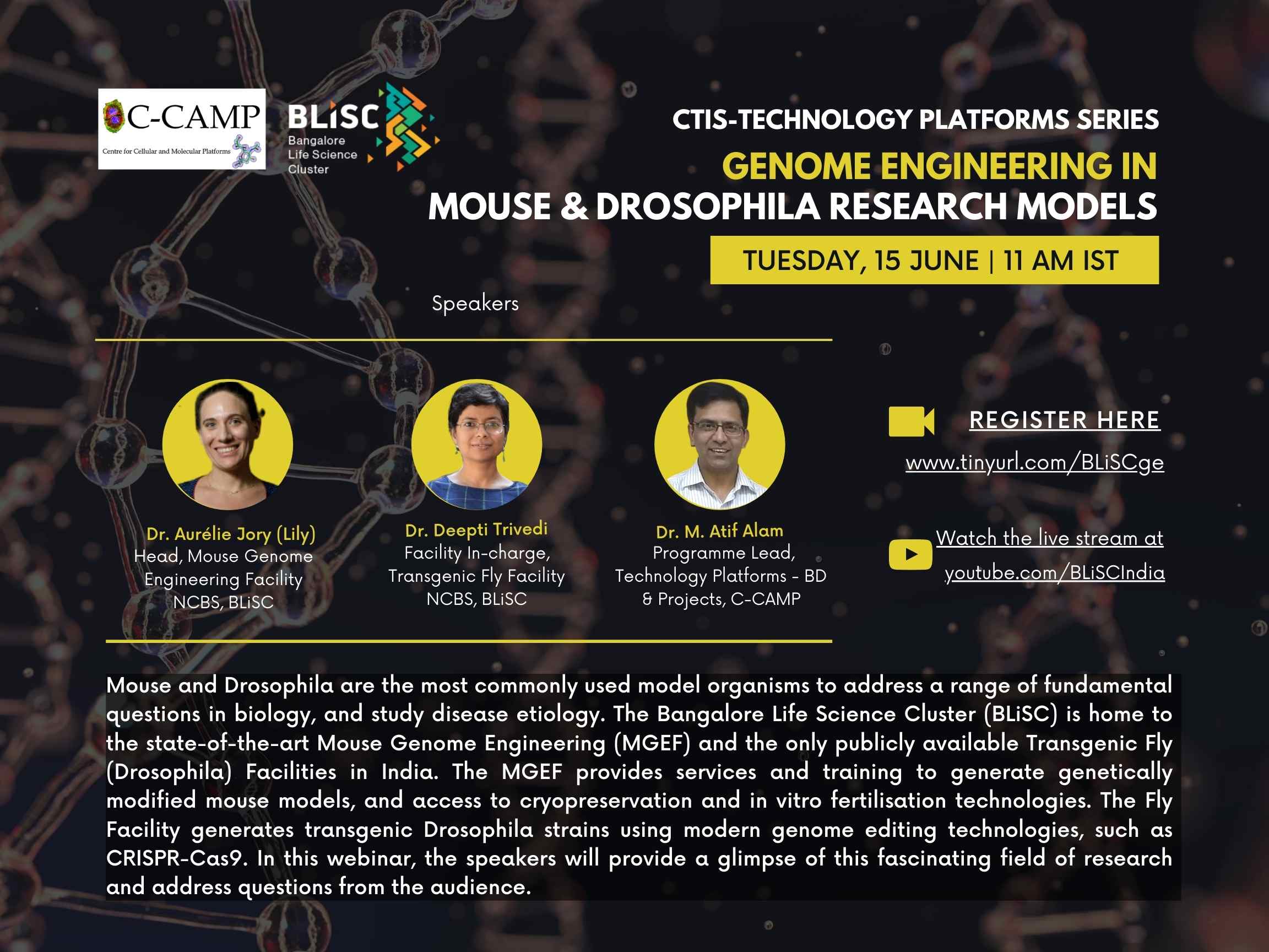 Speakers for the day: Dr Aurelie Jory, Head, Mouse Genome Engineering Facility, MGEF, BLiSC, Dr Deepti Trivedi, Head, Transgenic Fly Facility, BLiSC and Dr Mohammad Atif Alam, Programme Lead, Technology Platforms- BD & Projects, C-CAMP