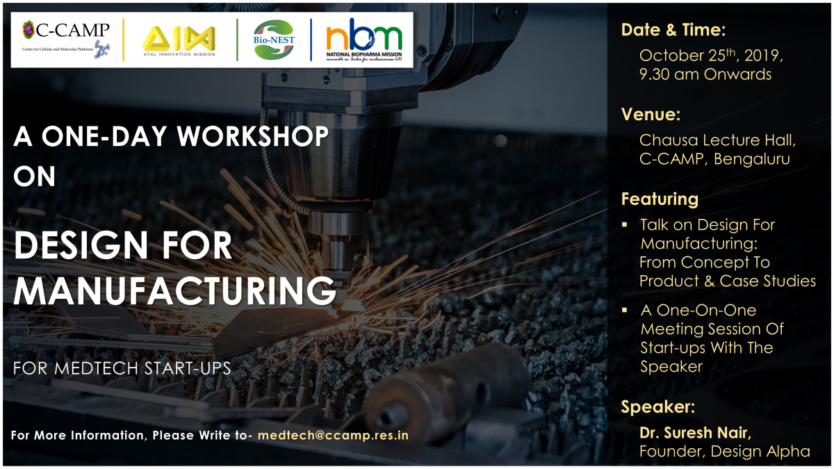 C-CAMP Med-Tech Forum announces a workshop on "Design for Manufacturing" for medtech start-ups.