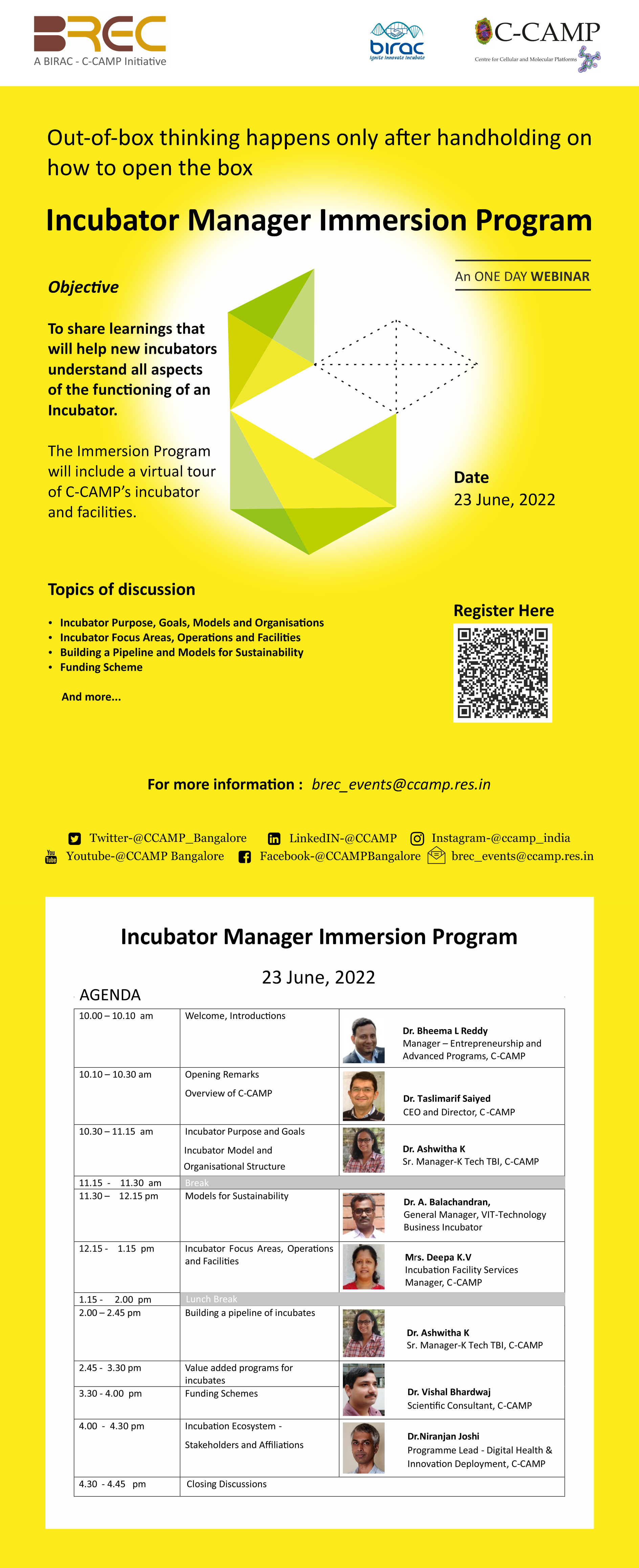 CCAMP's award-winning incubation facility is holding a virtual 1-Day Incubator Manager Immersion Program under the BREC program with BIRAC.