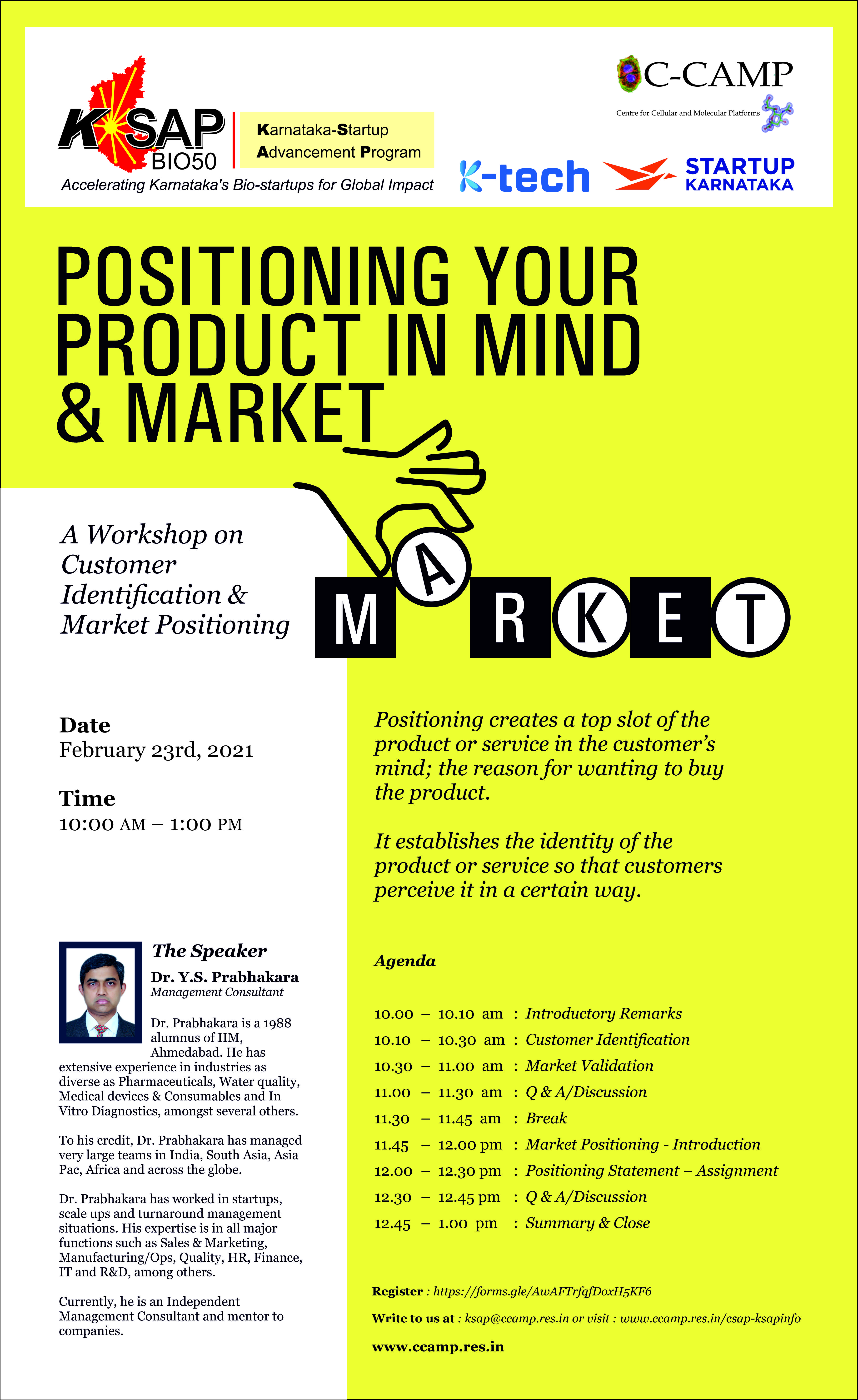Learn how to do it best from expert management consultant, Dr Y. S. Prabhakara in a CCAMP K-SAP BIO50 workshop on customer identification & market positioning
