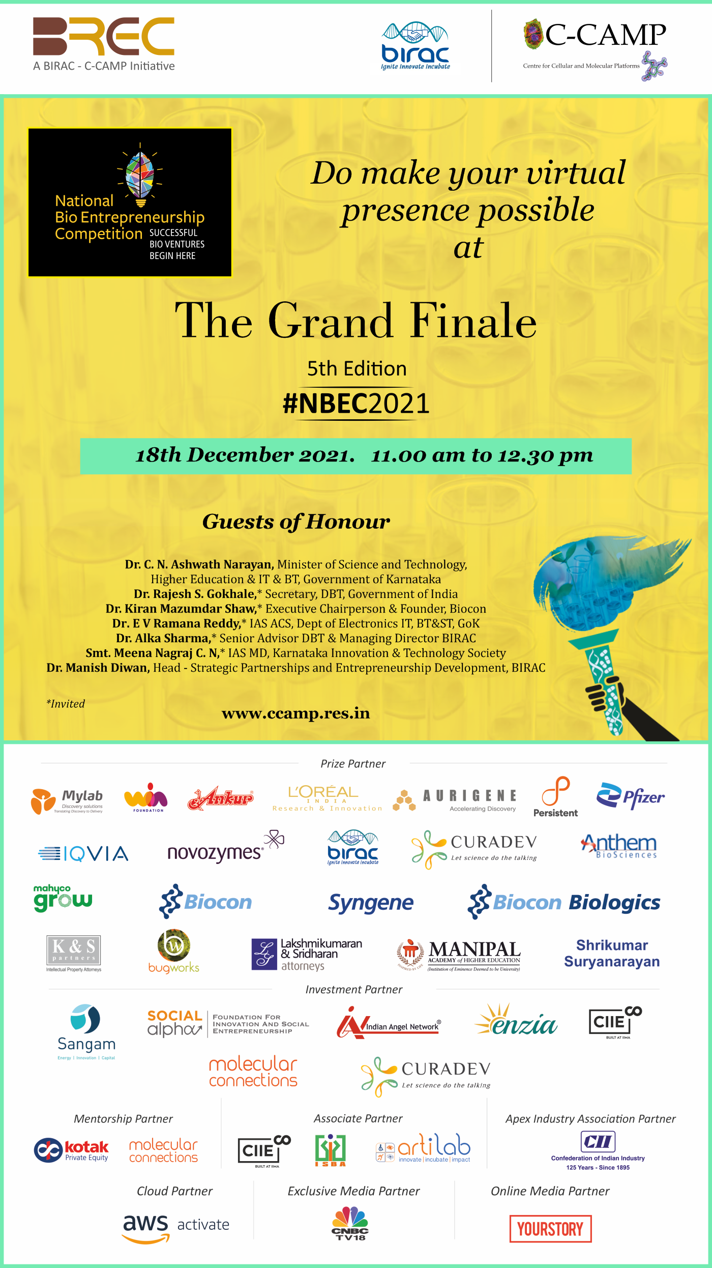Announcing winners from a competition of 4 months, 2400+ ideas, 34 national & international partners & total kitty of 8.6Cr+ INR in cash prizes & investment opportunities at the Grand Finale of C-CAMP - BIRAC National Bio Entrepreneurship Competition NBEC 2021!