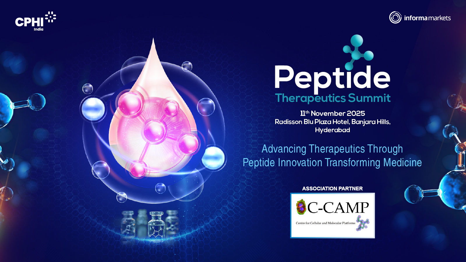 C-CAMP is delighted to bring the Peptide Therapeutics Summit, a one-of-a-kind event convening industry, startups, MSMEs, innovators and researchers from the exciting field of Peptides as novel therapeutics, along with CPHI, India and Informa Markets. C-CAMP has come on board as an Association Partner for this Summit which aims to transform modern medicine through the emerging science of peptide innovation.